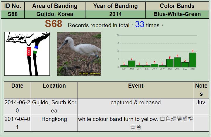 Common Greenshank C0 was ringed on 10-Sep-21. It was reported 10 times at Mai Po. This is the 1st report of this 2023-24 season.