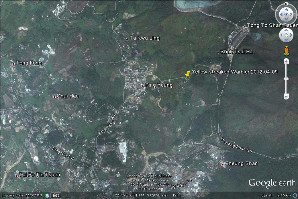 From Wo Keng Shan Road (just before the NENT landfill) follow the road through some plantation woodland. After the track comes out of the woodland, it bends around the base of the small hill. Before you reach the burnt area, on the left is a single house. The bird was alongside the track, initially just above the track but it later flew down towards the house. It was perching mostly in low trees and singing frequently.