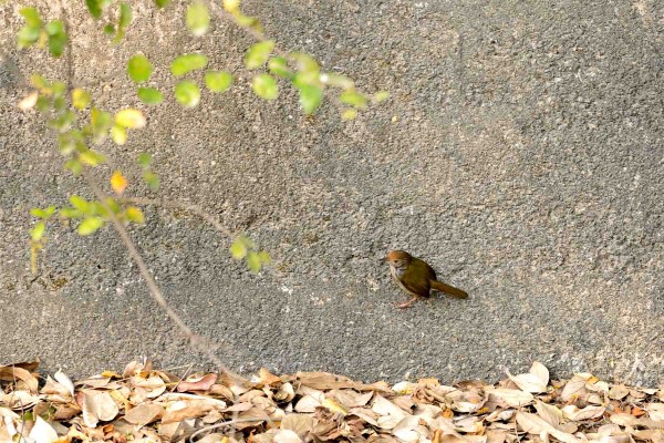 A bird hovered over Shek Kong Channel in the afternoon of January 12th.  It landed on a retention wall above a line of dried out leaves overlooking at a bush of creeping twigs.  It is an extraordinary common tailorbird.