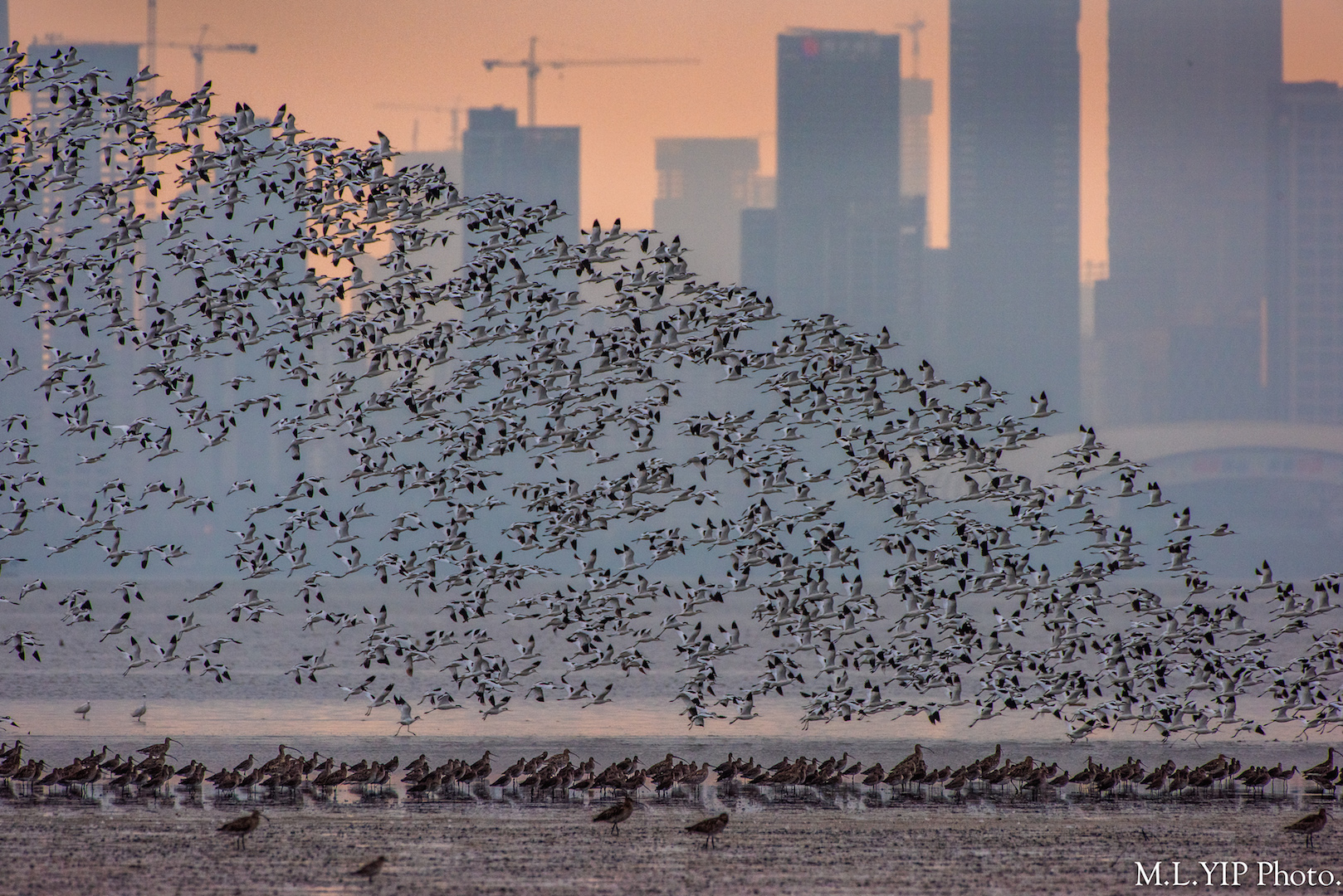 反嘴鷸群飛而起,是米埔泥灘常見的一幕,可惜對岸的樓房愈蓋愈高,真擔心仍會有多少的天空讓鳥兒去飛.