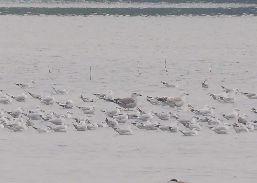 This gull was seen at Nam Sang Wai this morning.  It has a broad dark band at tail but it seems not a Black-tailed Gull as its bill is dark instead of yellow and its neck is not short.  Though its forehead looks like a Slender-billed Gull, yet its iris is dark and not white. It has a flat/long forehead and white eye lids as a Pallas's Gull, but its bill is not yellow nor big.