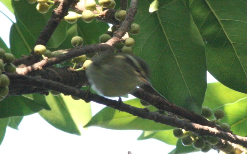 1) Claudia's Leaf Warbler Phylloscopus claudiae by  smaller size; less distinct and pale crown stripe (very distinct and much brighter crown stripe in Claudia's LW); no obviously white margin of tail (distinct thin white margin on tail underside in Claudia's LW) and thin tarsus (thick in Claudia's LW).