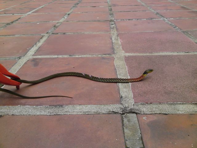 My garden is a very poor habitat for snakes- all tiles and flowerpots.  There is really only one point of entry as the garden is surrounded by a wall.  I think the shape of the path and the steps down tend to guide snakes towards the gate and once in they can't get out.  The surrounding area is a mix of scrubby grass, small vegetable plots and village houses.  I had no snakes in the garden last year but seem to be making up for it now.