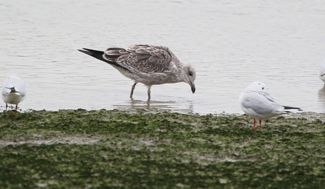 The second one is much darker and shows much more streaks on the head and the rest of its (visible) body. The upperparts show rather dark feathers (certainly if compared to the Black-headed Gulls). This would fit Heuglin's Gull [Larus (fuscus) heuglini] nicely, as other species such as Mongolian and Vega Gull have less dark upperparts. It looks much too slender to be a Slaty-backed Gull. I presume this bird to be in its second calendar year.