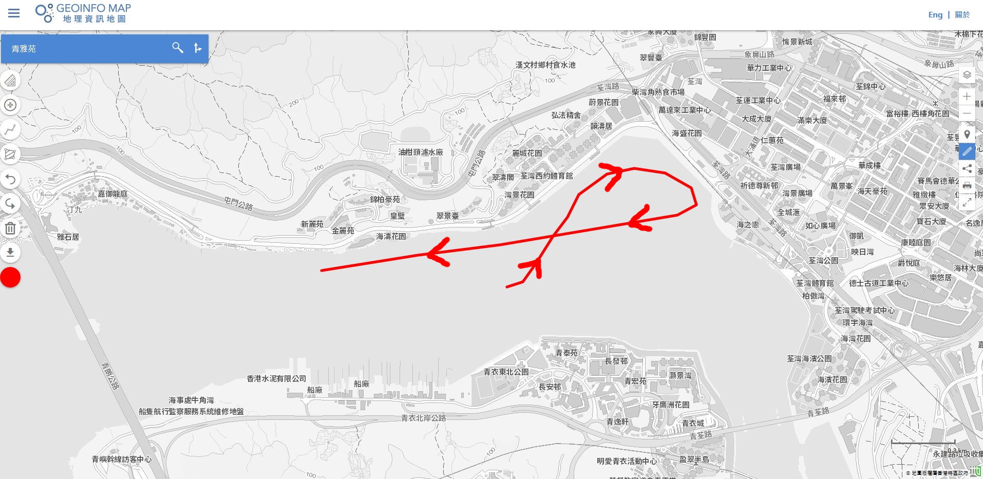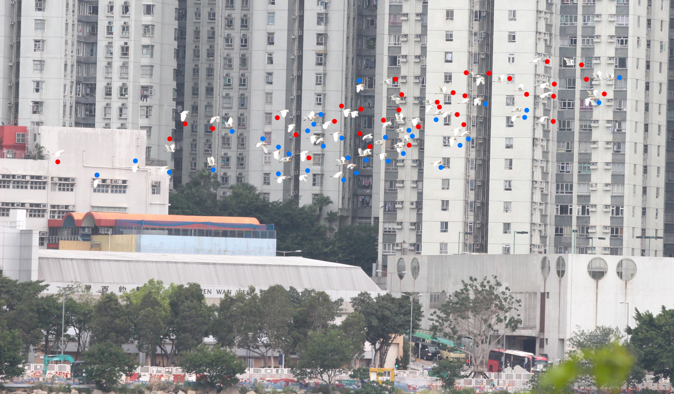放大看是一群小白鷺及牛背鷺混合的群體。紅點為小白鷺(黑嘴及黃腳趾)共35隻,藍點為牛背鷺(黃嘴或有頭部金色的繁殖羽) 共34隻,兩種鳥合共69隻。在荃灣對出海面飛了一個圈後向西飛去,並穿越汀九橋。(見下圖)