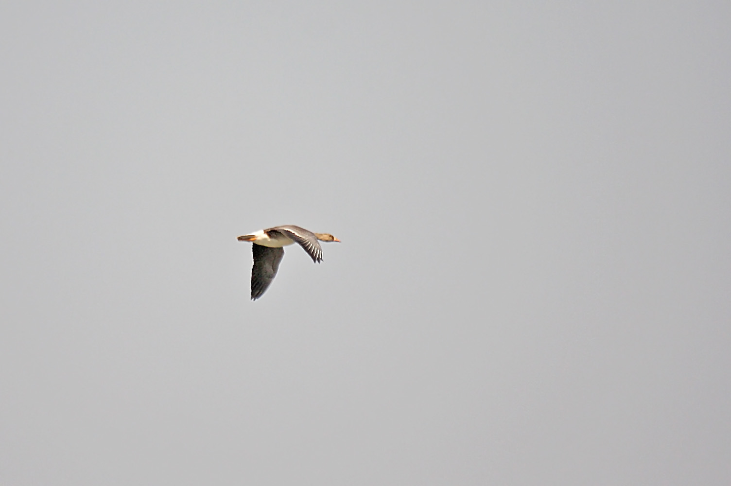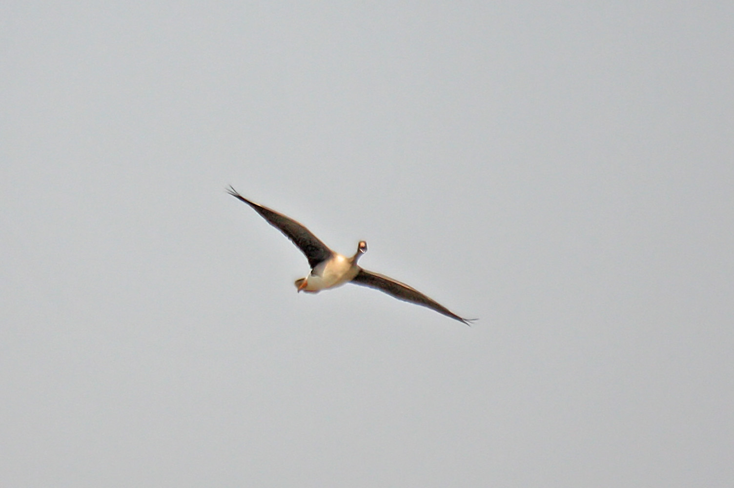 Pink bill, orange legs, unmarked belly and dark underwings fits to juvenile Greater White-fronted Goose.