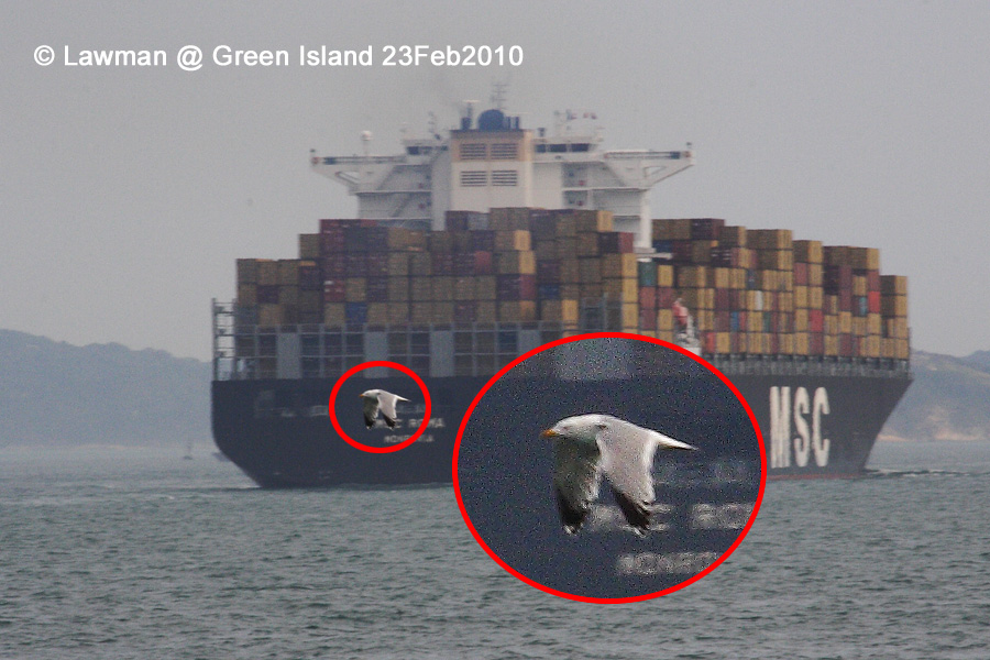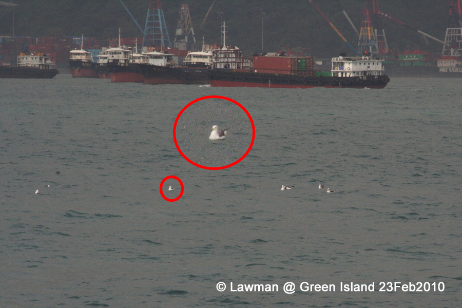 23Feb2010 : 8-9隻下午約4時30分在青洲向九龍的停泊遠洋船浮泡附近浮游 (around 4:30pm, 8-9 unknown gulls show up at the sea near Green Island)