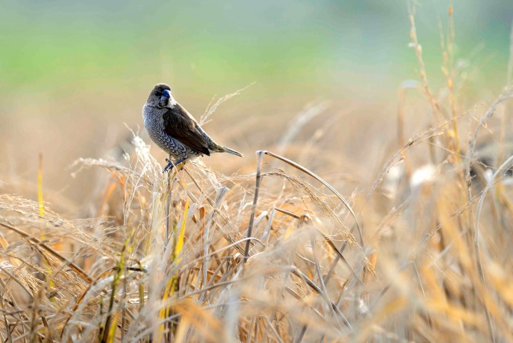 A flock of scaly-breasted munia were having a feast on a paddy field at Long Valley on January 31st.  At this moment they hovered at the crown of the straw busy pecking at the ears of the grain.  At the next moment they landed on the ground picking up the seeds.  Only this particular munia stayed on the top of a stalk at all time.  He takes up a watch guard post for the colony.