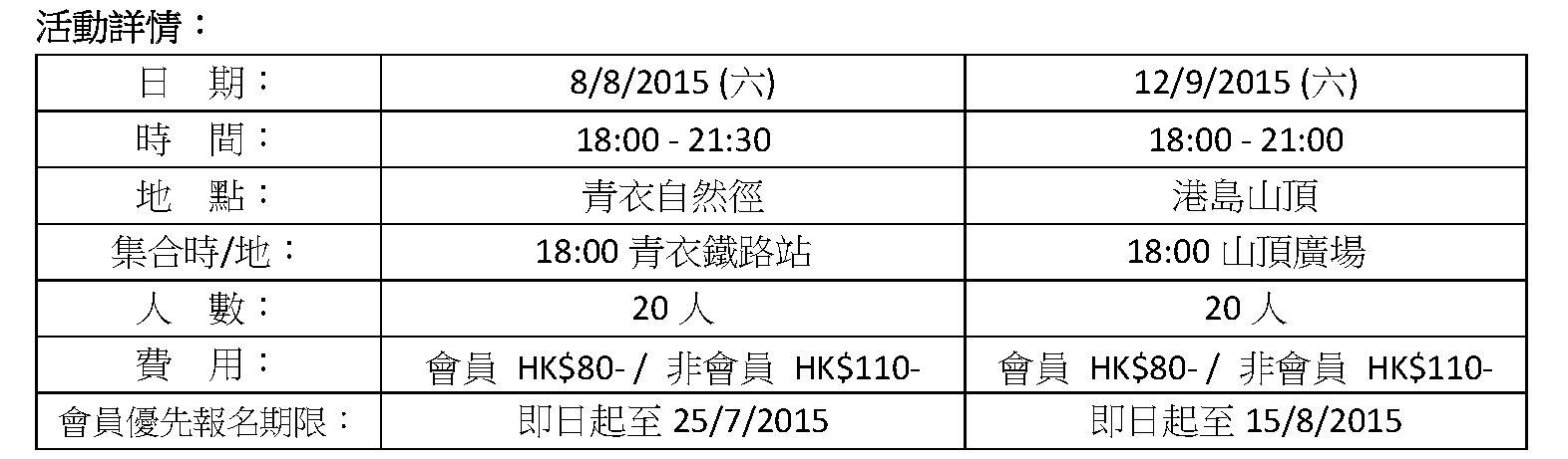 - 惡劣天氣安排:如當天活動前2小時天文台仍然懸掛三號或以上「熱帶氣旋警告訊號」、紅色或黑色「暴雨警告訊號」,當日活動將會取消。如活動進行中天文台發出「雷暴警告」,領隊會視乎情況決定是否繼續或取消其餘行程。如活動當日遇上有關天氣問題,可致電 9457 3196 向當天領隊查詢。