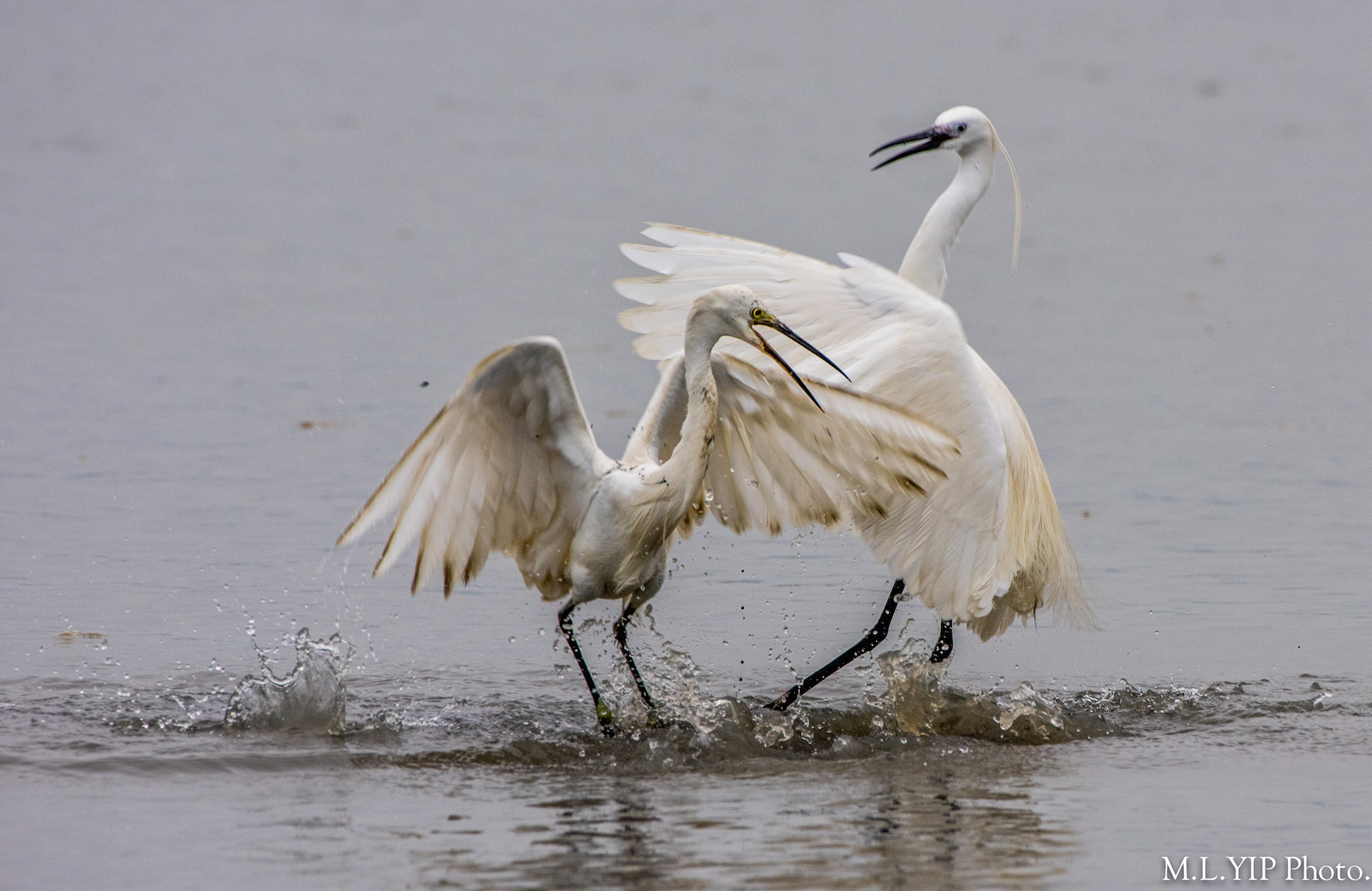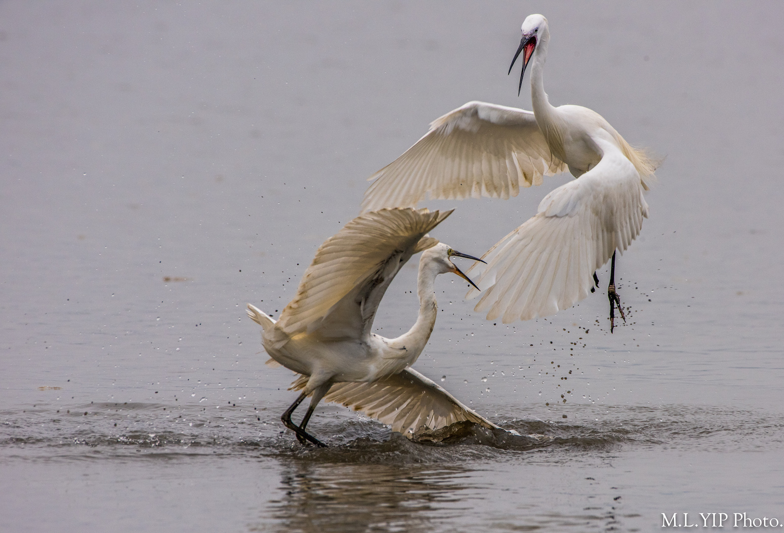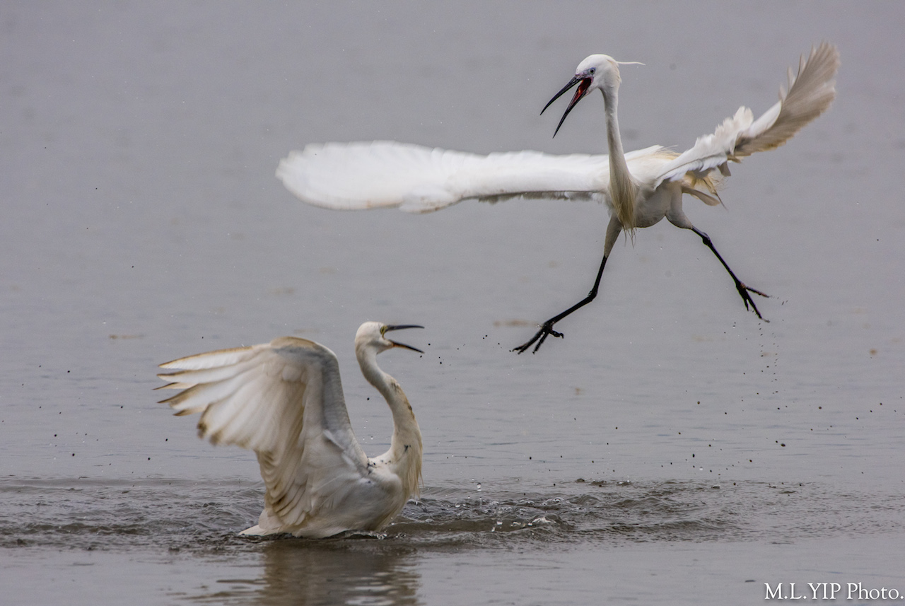 兩隻小白鷺為爭奪覓食地盆,大打出口.