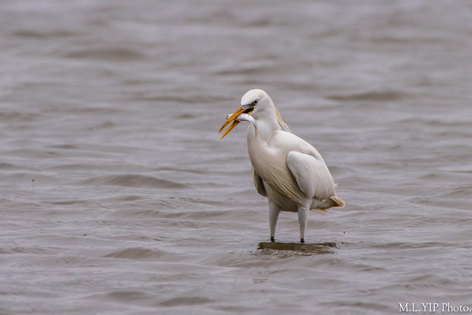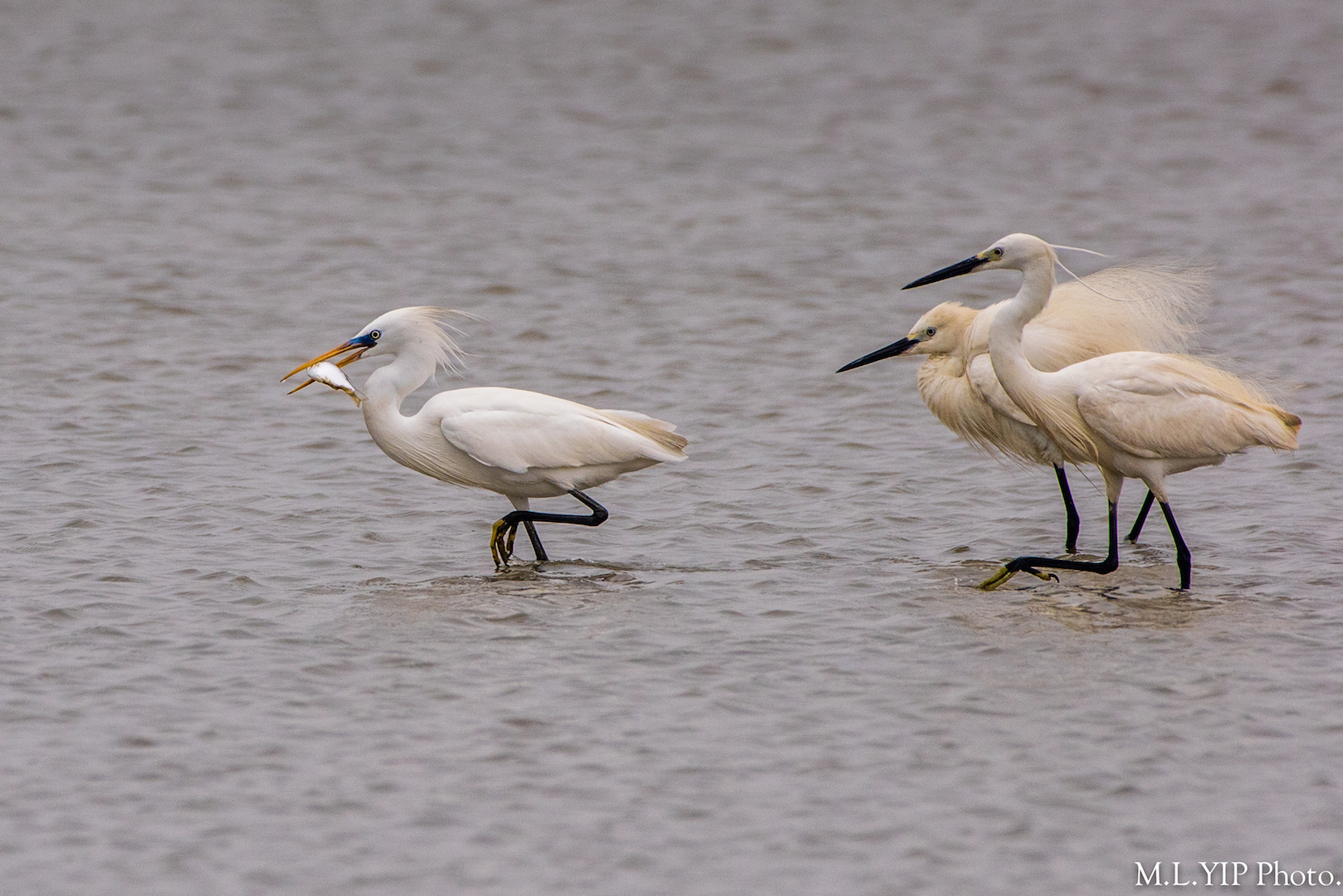 黃嘴白鷺捕得一尾小魚,馬上惹來二隻大白鷺虎視眈眈,幸好黃嘴白鷺最終也能把小魚吞下.