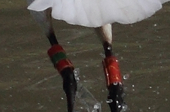 Left leg: 3-coloured ring, red top, yellow middle, green bottom