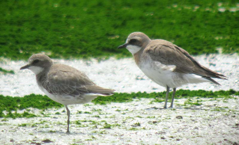 紅腹濱鷸,左為蒙古沙鴴雄鳥,蒙古沙鴴的橙色胸帶較為深色,黑色線比較明顯,背部比較偏灰色。