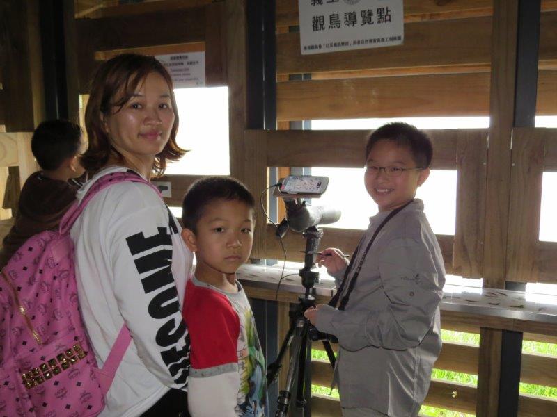 跟他的媽咪從旁觀察,陳小朋友充滿自信的為遊客們介紹所見的鳥。
