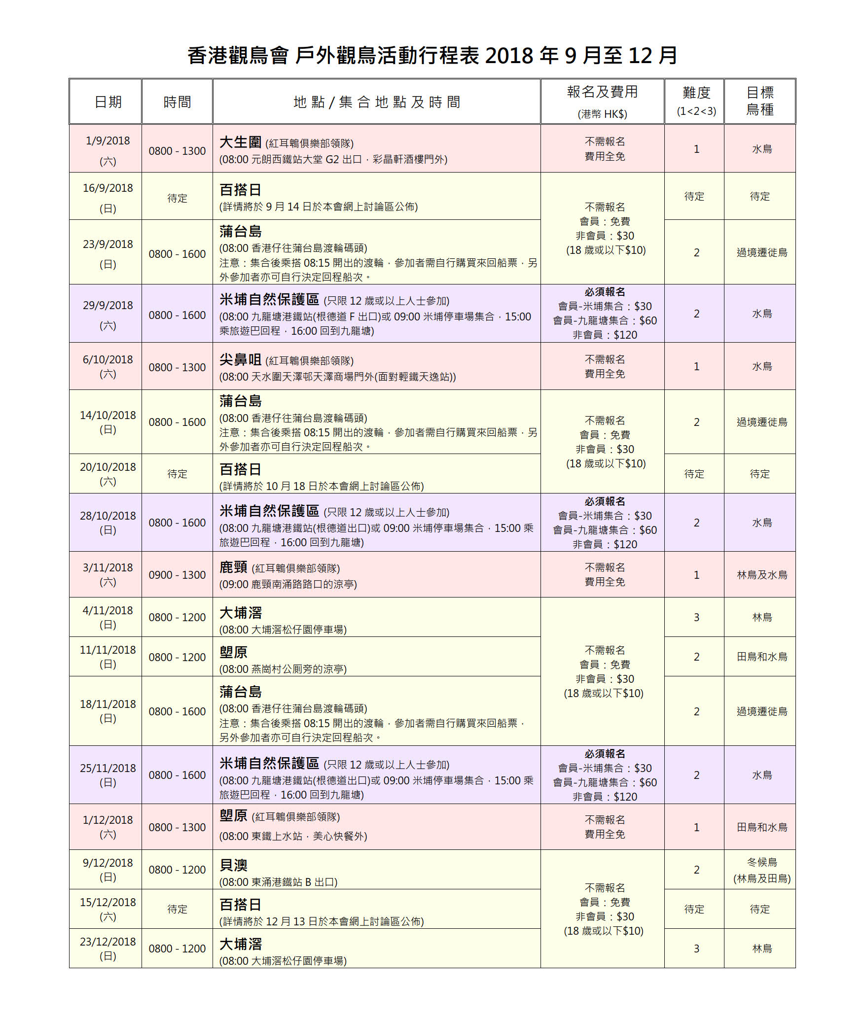 2018年 9-12月戶外觀鳥活動時間表 Sep-Dec 2018 Outing Timetable