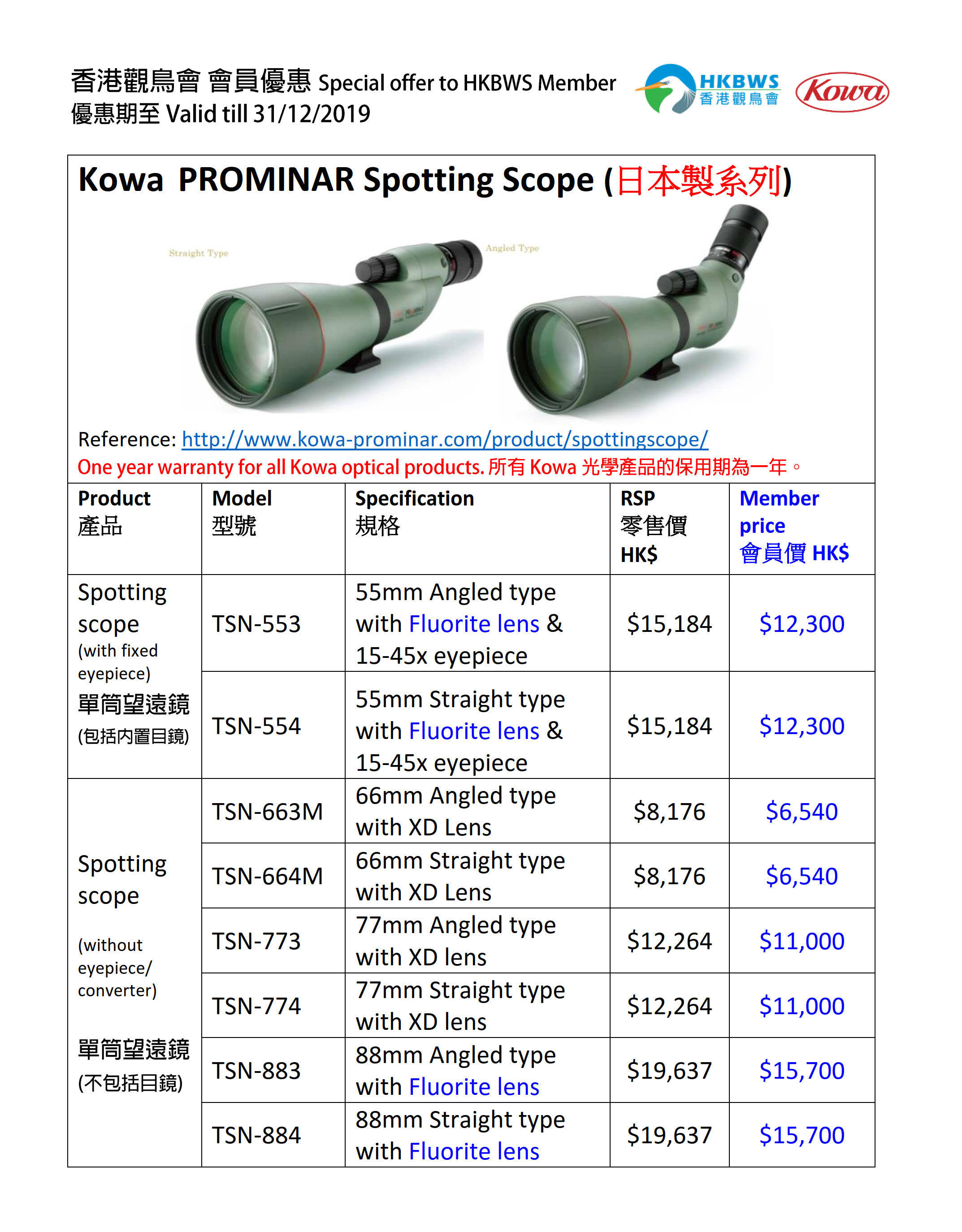 KOWA 望遠鏡優惠 ~ 2019年 8月 至 12月