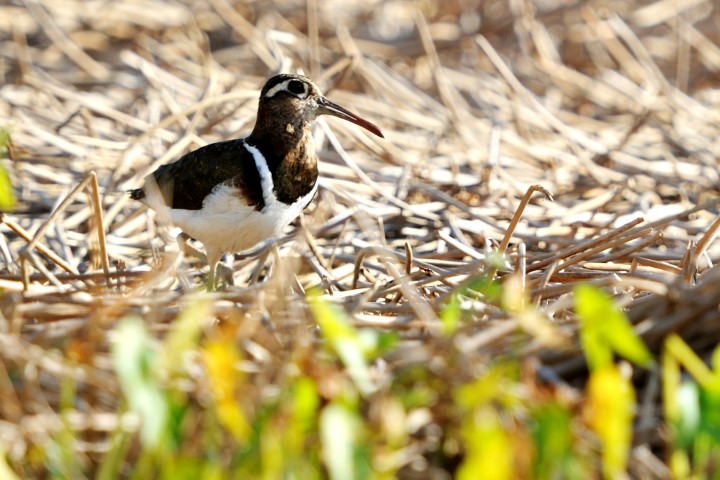 A pair of greater painted snipes appeared in Long Valley on December 17th. They occupied two adjacent ponds covered with water plants in shallow water. This snipe exposed itself momentarily when it switched from the wet land to dry ground. However, its mate hided among the water plants without showing its face for the whole day.