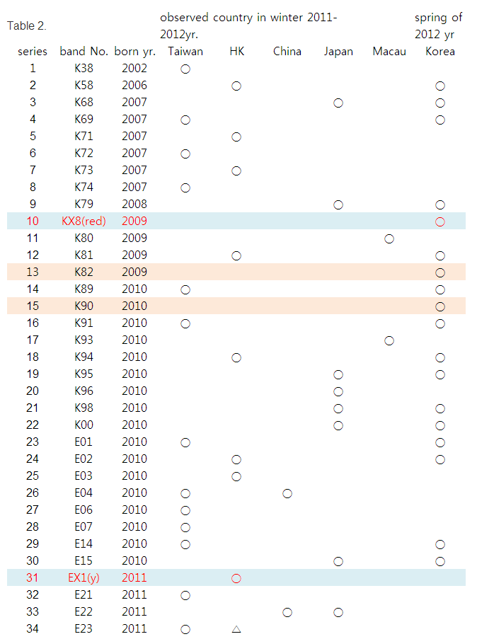 經過韓國專家Dr. Kisup Lee把環誌黑臉琵鷺於2011至2012年的觀察紀錄(主要記載於韓國,香港及臺灣的數據庫)整合後, 得出了一些有趣的結果。由2002年開始, 總數有134隻黑瞼琵鷺被環誌,當中有58隻於2011至2012年的冬天於越冬地曾被目擊,58隻被觀察到的雀鳥當中有23隻冬季過後重返南韓,當中更包括K82及K90這兩隻未有於越冬地被觀察到的黑臉琵鷺。換言之, 於134隻被環誌的黑臉瑟鷺中, 有多達60隻於一年之間被觀察到,佔整體44.8%。有41隻在2011年夏天出生的幼鳥被環誌,其中的29隻於當年冬天於越冬地再被觀察到,至少70%已環誌的幼鳥在首次遷徙中成功到達越冬地,比2010年的65-68%為高。事實證明, 環誌工作對黑臉瑟鷺的保育及監察有一定的作用, 另外亦要多謝各位有份提交環誌黑臉琵鷺觀察記錄的鳥友,希望各位可以繼續支持黑臉琵鷺的保育工作。