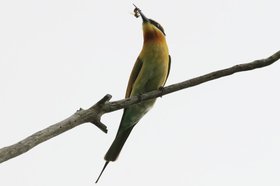On that day (12 May 2013), I saw two blue-tailed bee eaters caught several bees (and bees only).  The bird typically smashed the bee against tree branch to remove the sting before eating.