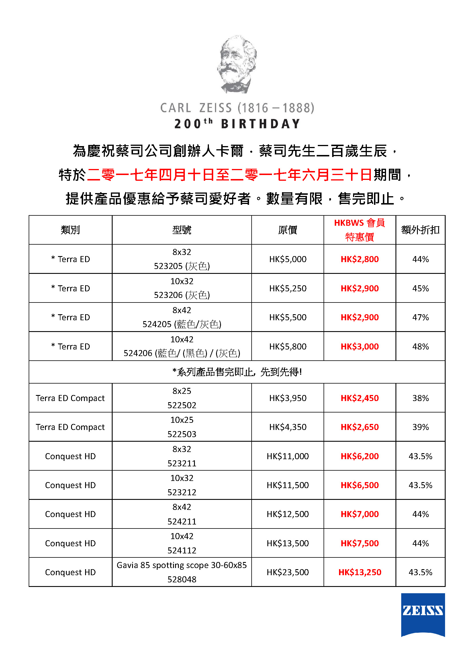 ZEISS 望遠鏡優惠 ~ 2017年4月 至 2017年6月