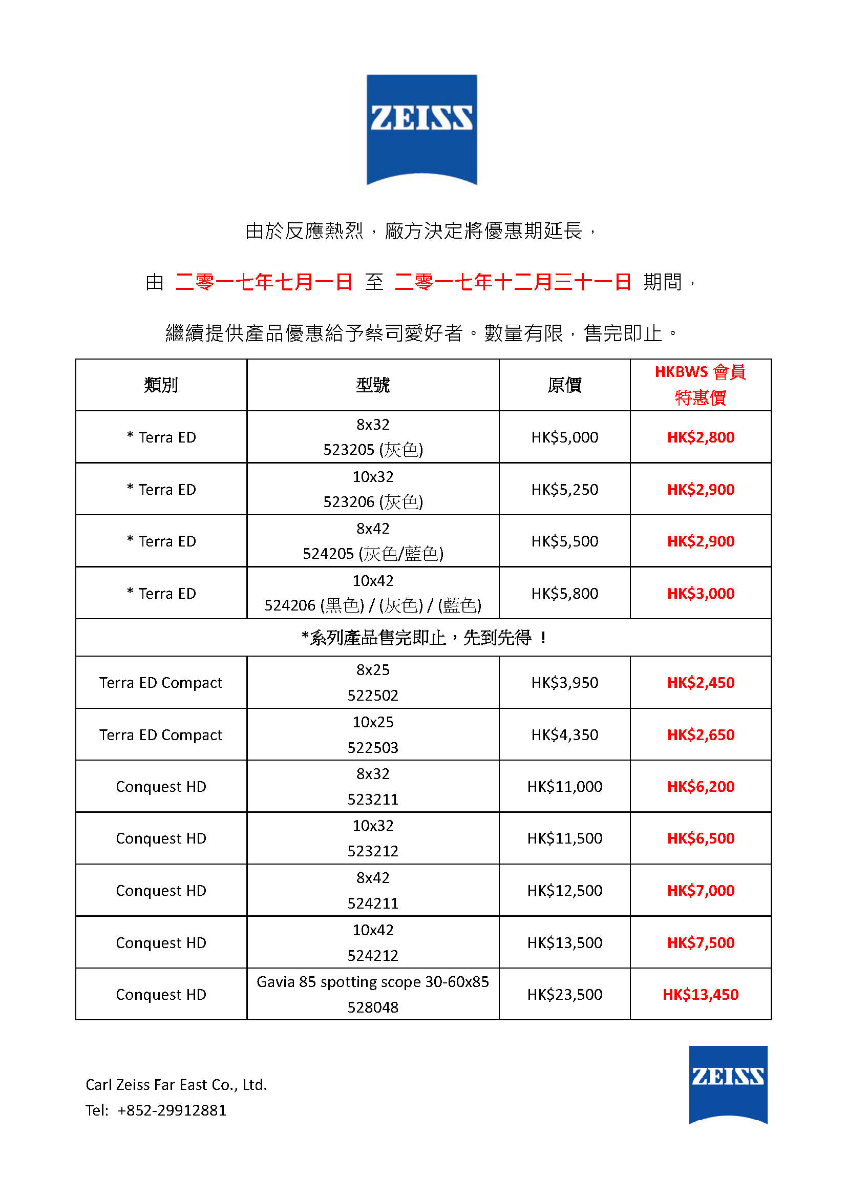 ZEISS 望遠鏡優惠 ~ 2017年7月 至 2017年12月