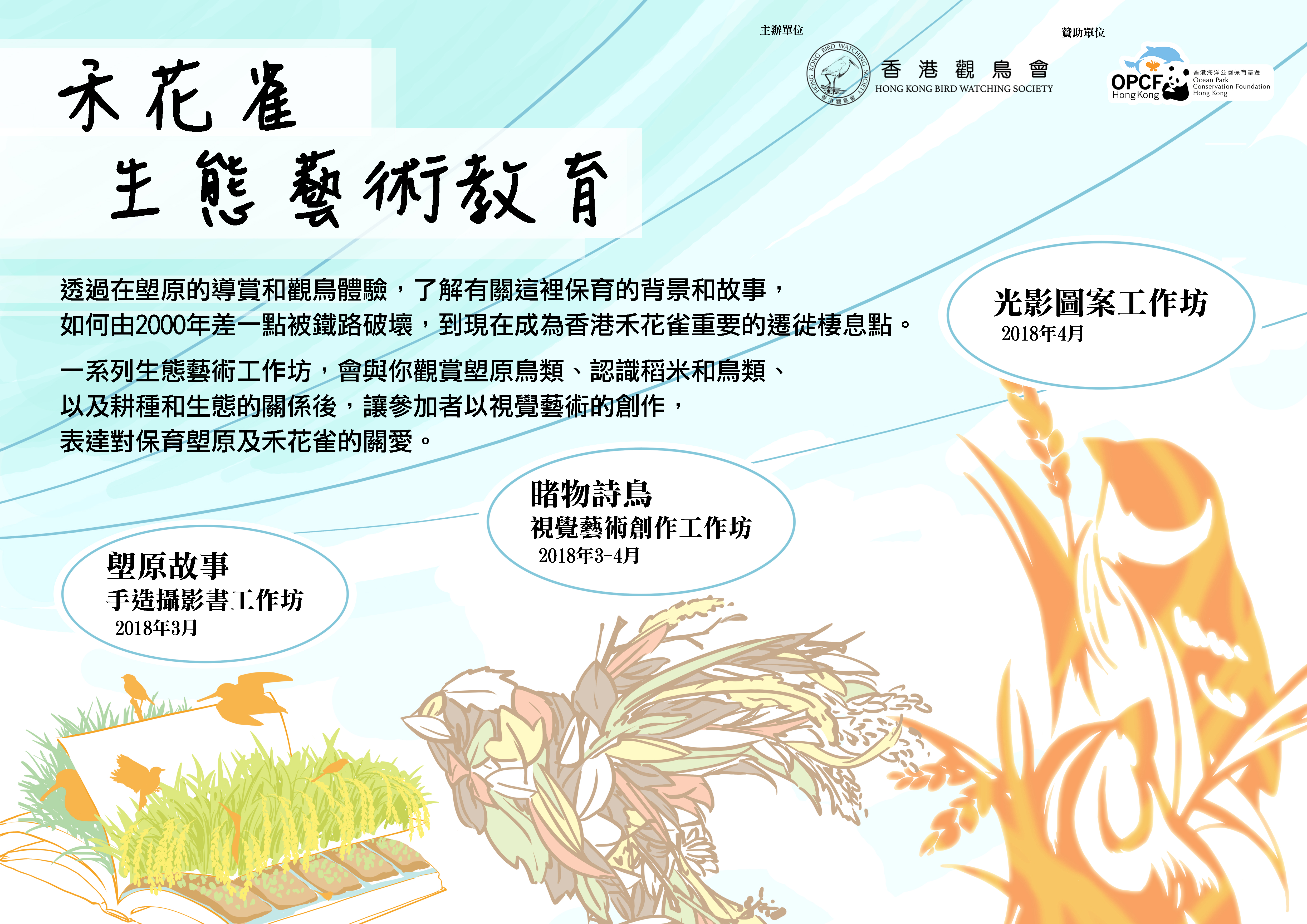 在2018國際禾花雀關注年,我們推出一系列禾花雀生態藝術教育活動,透過認識塱原及禾花雀的故事,再以藝術創作與大眾一起提升對禾花雀保育的關注。欲了解更多禾花雀生態藝術教育,請到以下連結: