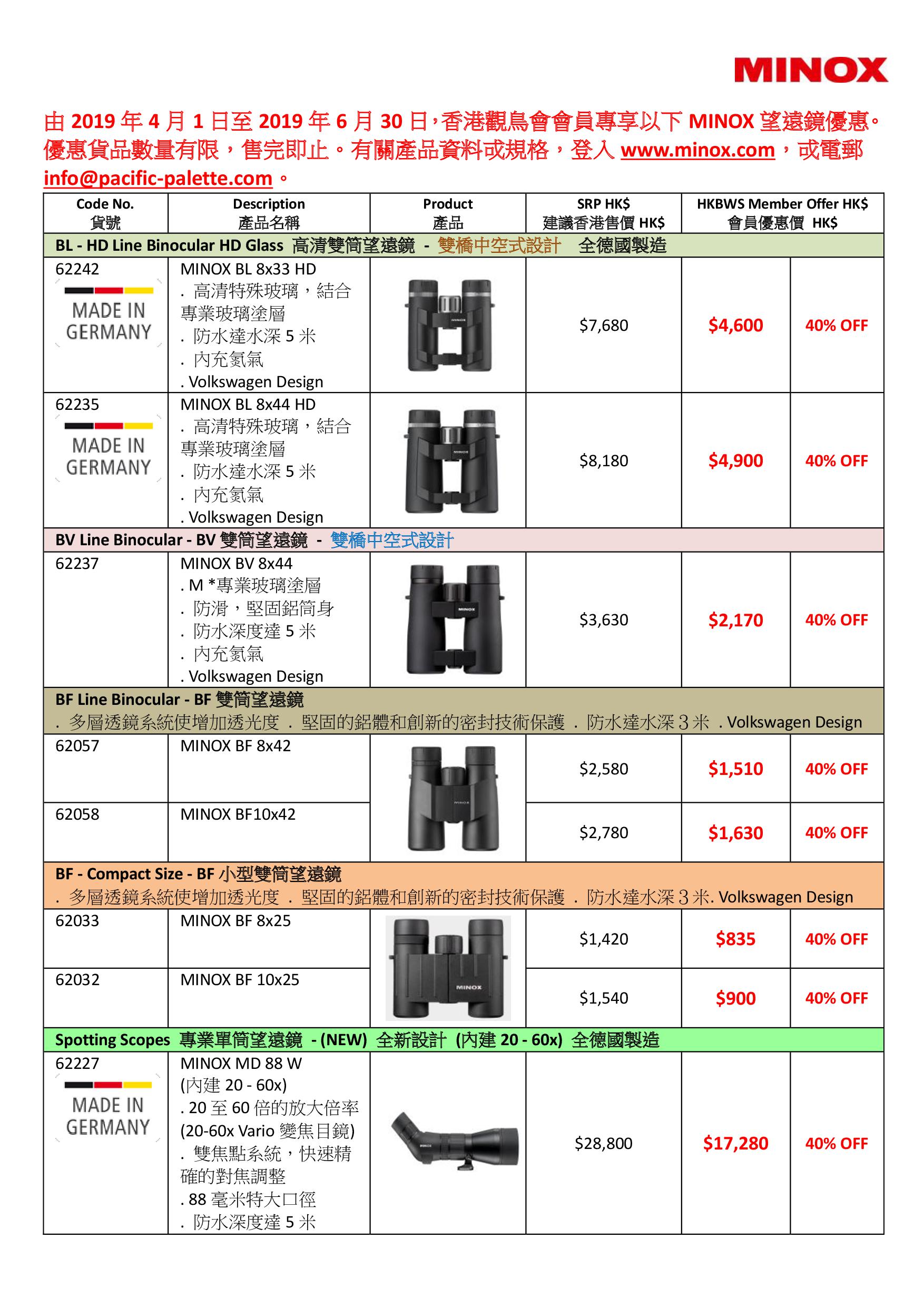 MINOX望遠鏡優惠 ~ 2019年 4月 至 6月 Special Offer of MINOX Binoculars ~ Apr to Jun 2019