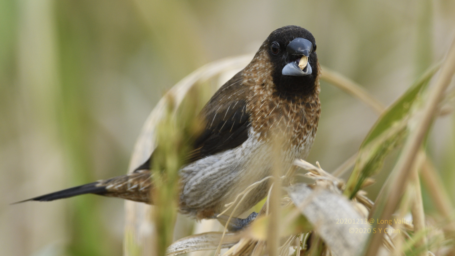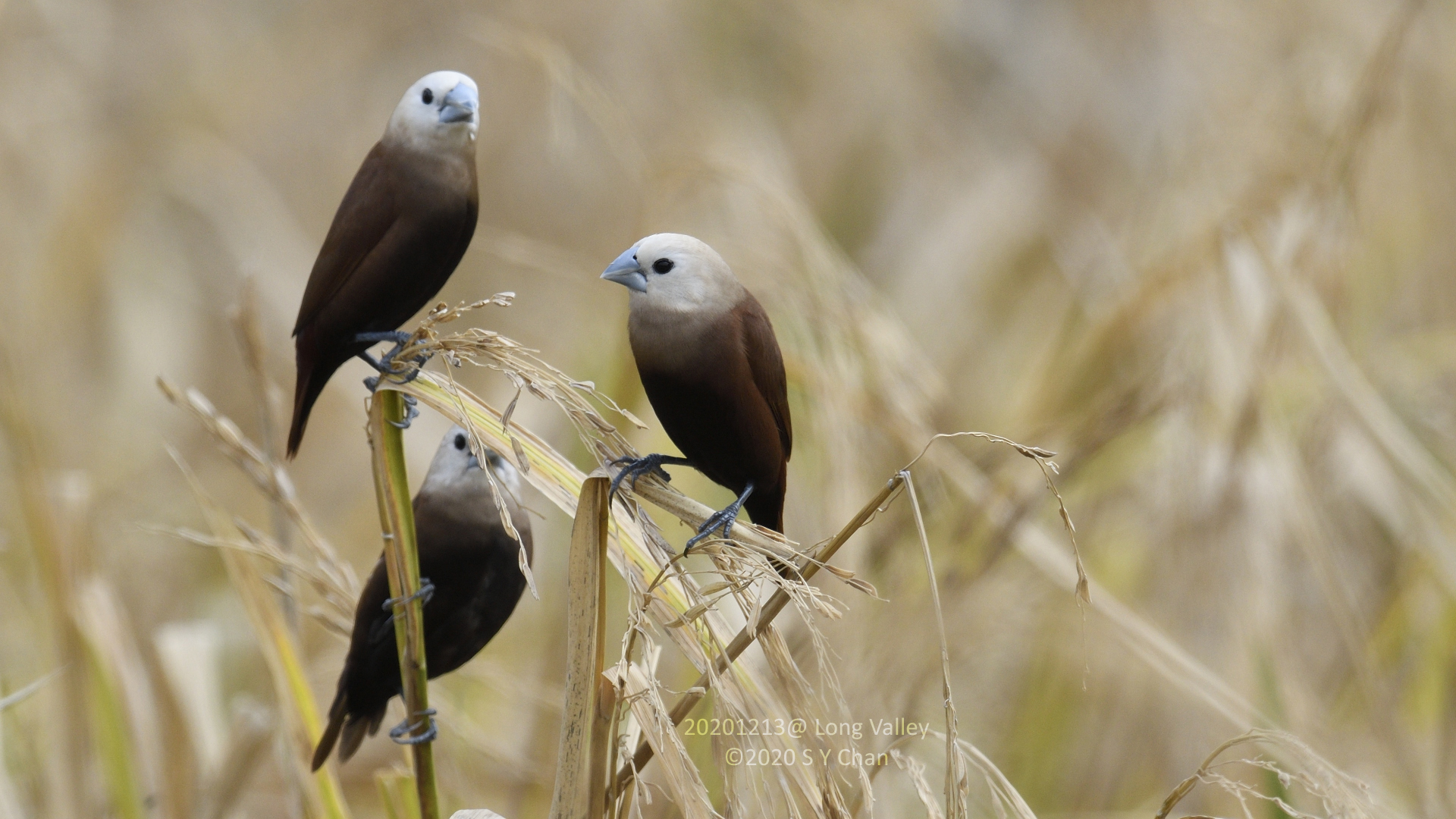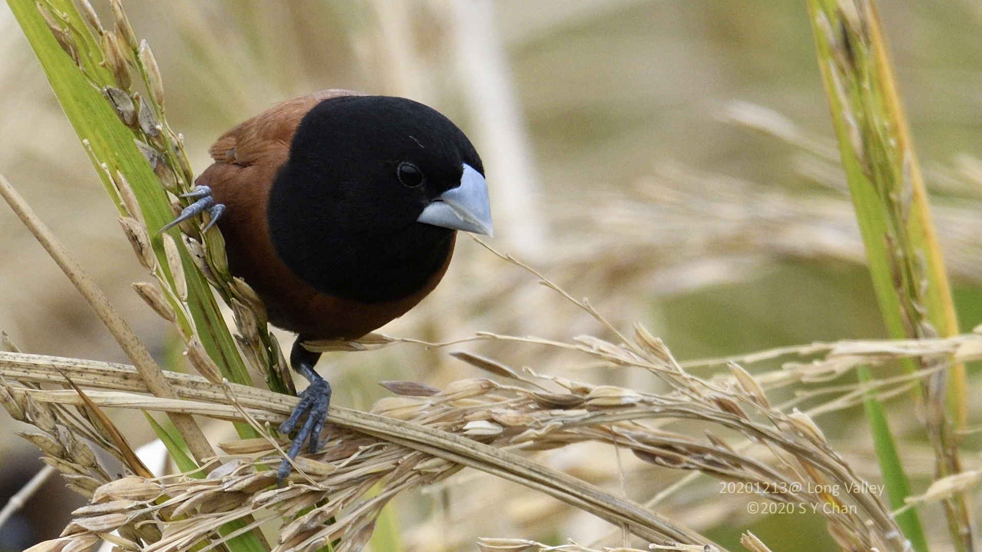 The ones shown in my photos should be Lonchura atricapilla, chestnut munia 黑頭文鳥 and not 栗腹文鳥.