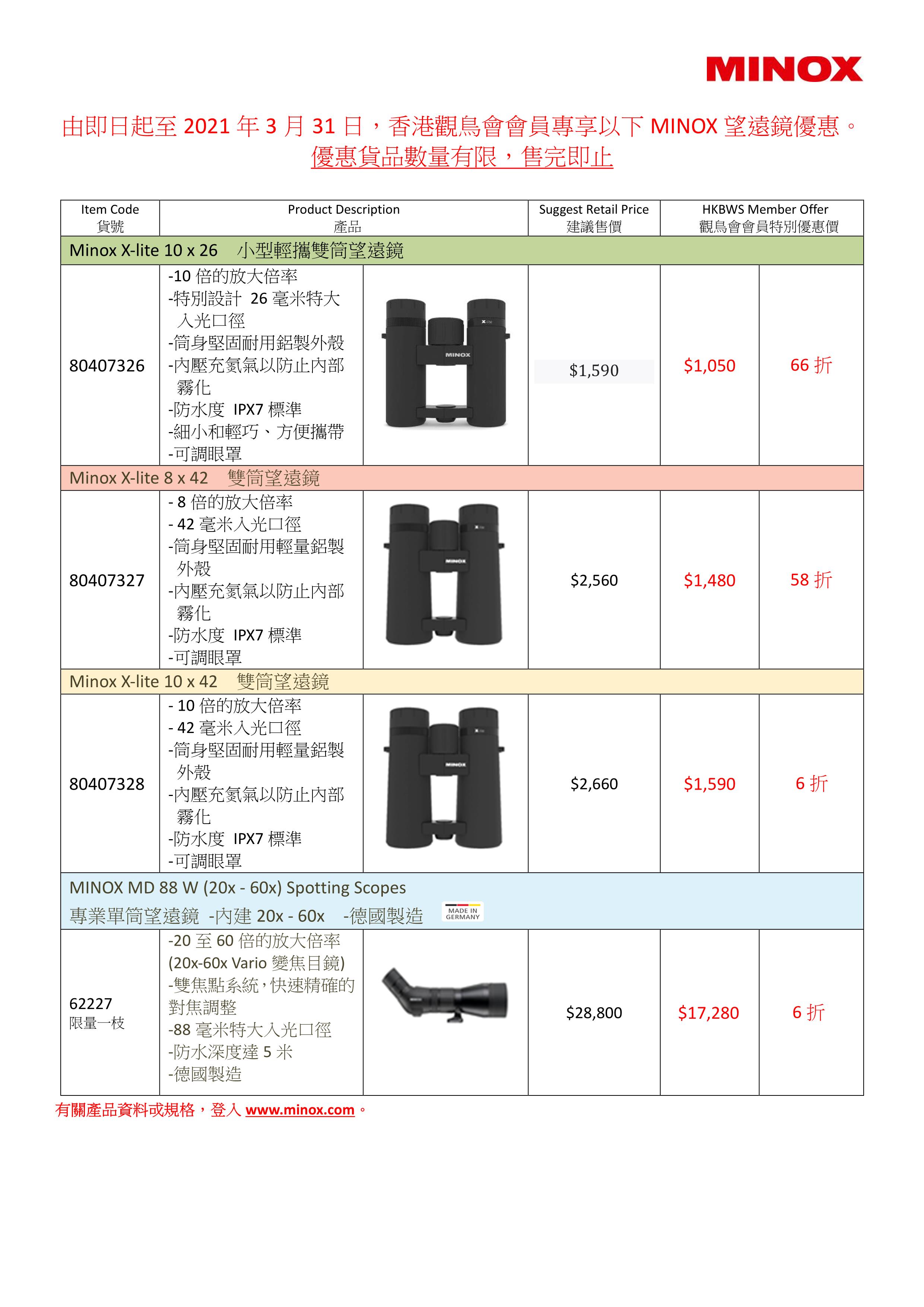 MINOX望遠鏡優惠 ~ 2021年 2月 至 3月 Special Offer of MINOX Binoculars ~ Feb to March 2021