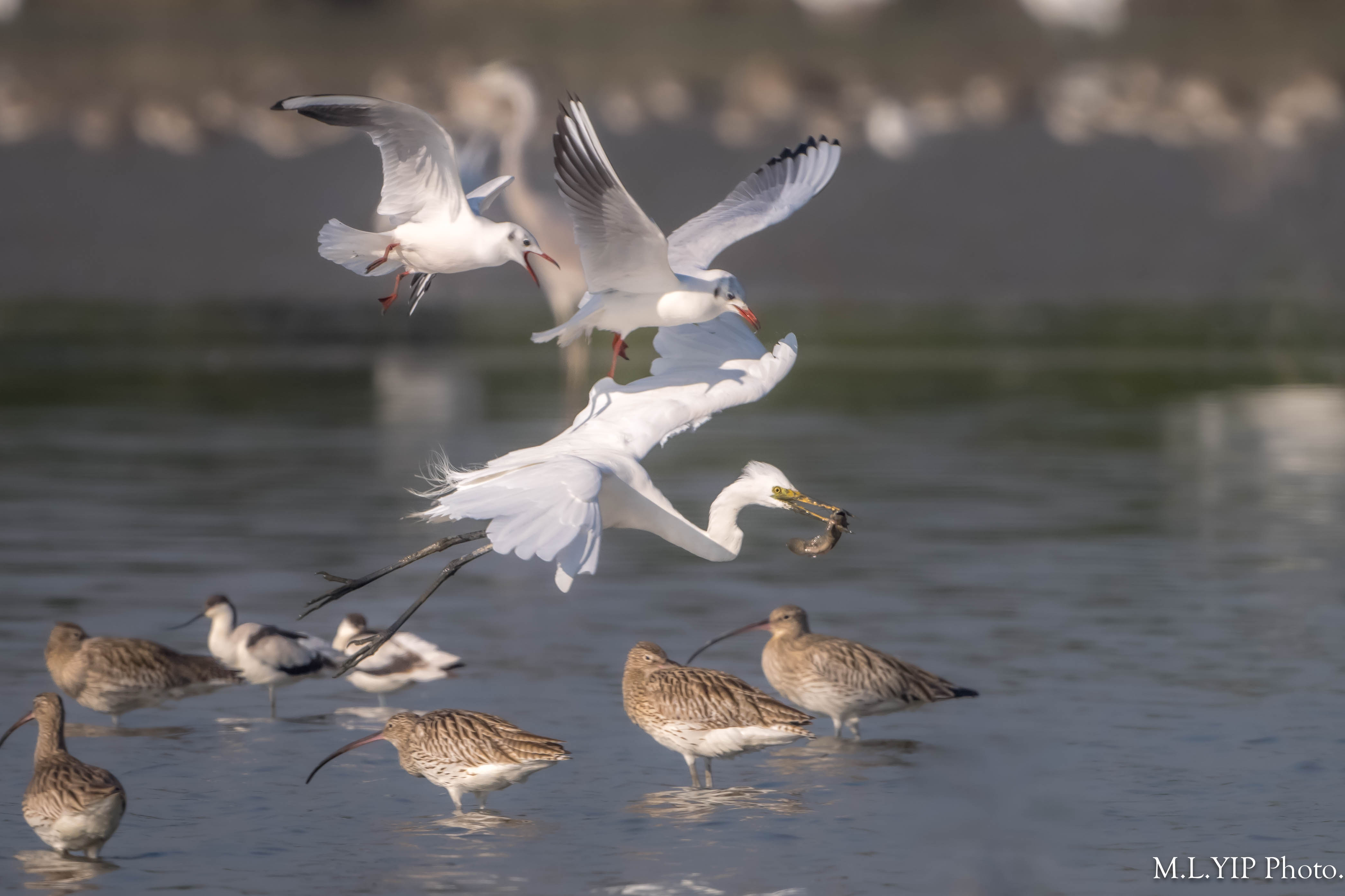 紅嘴鷗想搶白鷺嘴中的魚,混亂間,白鷺嘴一張魚就丟了.