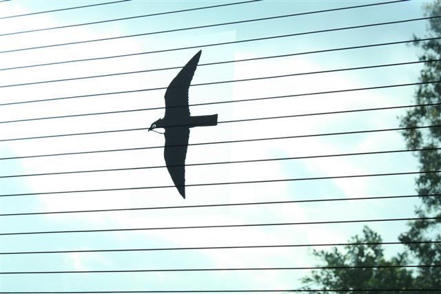 The second issue is that birds have evolved to fly through trees at speed. As a result, falcon silhouettes or other similar measures do not reduce mortality by a statistically significant level (Klem, D. 1990. Collisions between birds andwindows: mortality and prevention. JournalField Orn. 61(1): 120-128). Such objects have to be placed densely across the surface so as to break the glass into clear areas of less than either 4” vertically or 2” horizontally. Such a density may be OK for roadside noise barriers, but probably not for buildings. The effectiveness of such things would appear to come from their ensuring that a bird knows there is a solid surface, rather than any sense of fear posed by the silhouette of a falcon (which may not be an issue for certain species). Threats are only perceived as threats if they are backed up by action, so to speak.