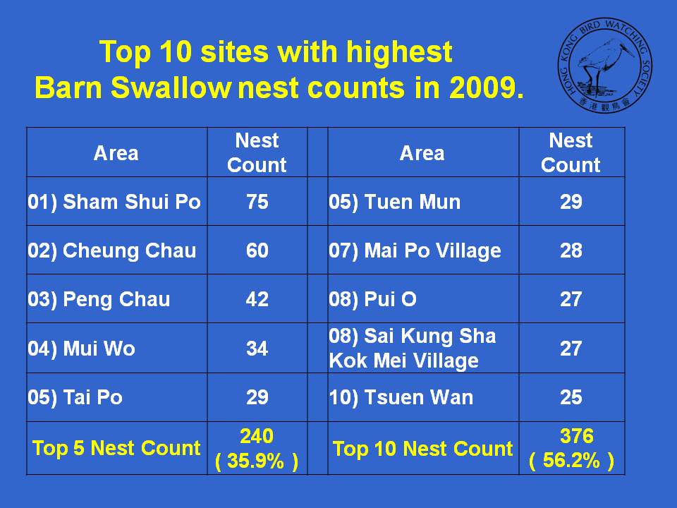 I notice that no nests of either species were recorded from the Aberdeen area. It may be worth surveyors having a look over on Ap Lei Chau (Main Street) and there are often Barn Swallows nesting there, and Little Swifts under the main Ap Lei Chau road bridge. Also there are several pairs of swallows nesting in Wong Chuk Hang on some of the larger industrial buildings