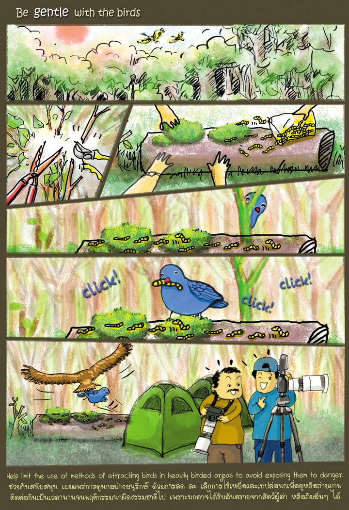Share with you a cartoon printed on Bird Conservation Society of Thailand (BCST) Bulletin promoting the awareness of bird's welfare. Thank you Vetida Pongpanit and BCST for the permission for using the cartoon.