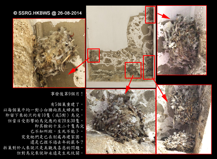 由於雨燕於日間外出覓食,故滅巢舉動未有造成燕群傷亡,卻令三十多隻原居雨燕無家可歸。雨燕群於當日傍晚歸家,發現家園突然消失,悲鳴聲此起彼落。性情固 執念舊的小白腰雨燕未有放棄家園,開始重新在原處築巢,每晚繼續留守空無一物的簷底,用爪死抓簷底牆身休息。現時簷下只剩少許舊巢痕迹,傍晚時分仍有不少 雨燕在簷篷外徘徊,部分掛牆休息,亦有部分以嘴啄着牆身似在築巢,至今只剩下十多隻留守。