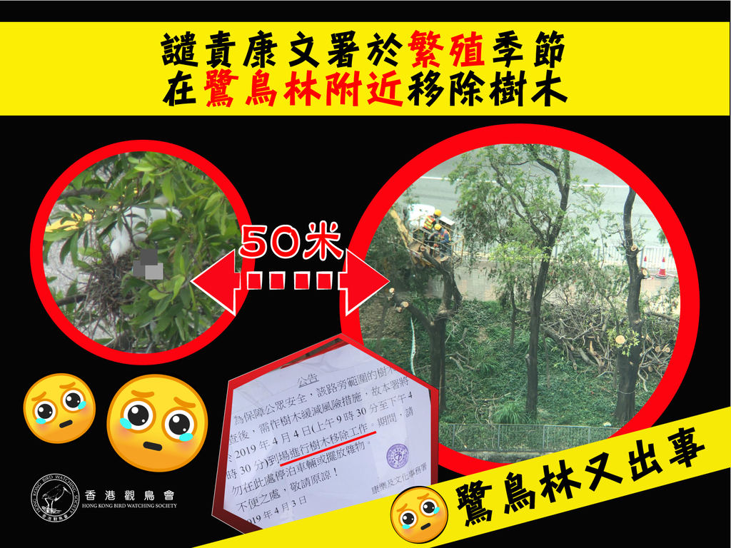 本會一直認為市民安全及雀鳥保育從不對立。只要妥善規劃工作流程,提前完成樹木評估(尤其是在鷺鳥林內或附近的樹木),讓修樹工程可以在繁殖季節前完成,既能照顧行人的安全,又能讓雀鳥安心繁殖。本會譴責康文署未就2017年大埔鷺鳥林事件吸取教訓,仍然容許樹木移除工作在繁殖期內及鷺鳥林旁進行。希望署方再次檢討工作流程,以確保類似事件不會再發生。