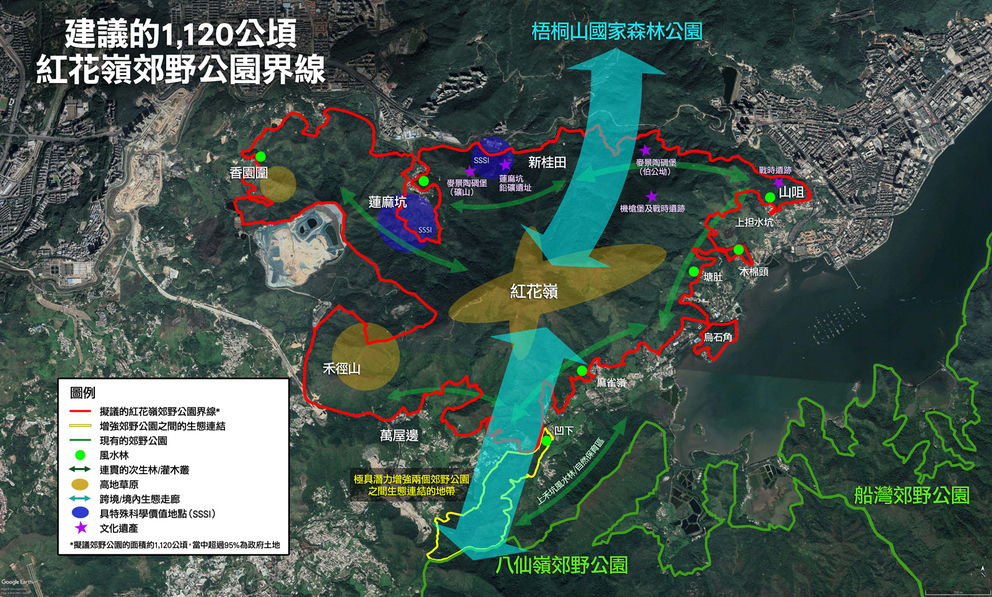 According to the 2011 Principles and Criteria[14], an AFCD policy document, conservation value, recreation potential as well as landscape and aesthetic value are the key themes of the intrinsic criteria for identifying suitable areas for designating Country Parks, while private land is not automatically taken as a determining factor for exclusion from the Country Park boundary. Therefore, the aforementioned areas of high ecological, historical, cultural and landscape value (please refer to sections 2, 3 and 4) should be included within the boundary of RNCP for nature and heritage conservation and management. Our proposed RNCP boundary, following the 2011 Principles and Criteria and respecting all the above RNCP justifications, is illustrated in the map attached.