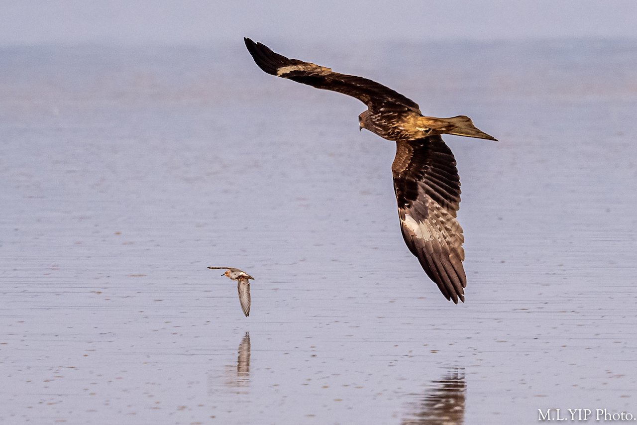 泥灘上黑鳶窮追一隻估計是紅頸濱鷸,結果如何? 你猜猜吧.