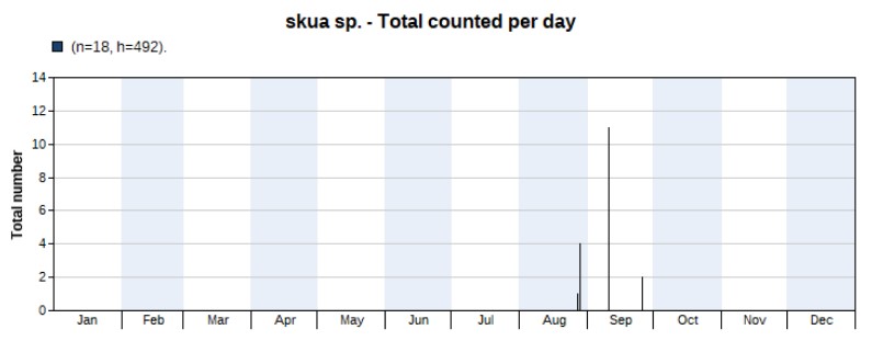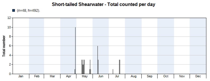 • Record non-stop hours seawatching were 12 hours and 15 minutes on 16 August and 12 hours on 7 July. We also watched for 10 to 11 hours non-stop on several other days.