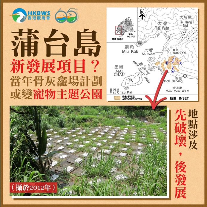 2012年,蒲台島大幅生境被破壞並鋪設石板,懷疑有人「先破壞,後發展」,試圖興建地下骨灰龕位。事件促使規劃署制訂發展審批地區圖,管制違例發展。2015至2016年制圖期間,逾7,000人參與本會的網上請願活動,支持將蒲台納入郊野公園。根據蒲台群島分區計劃大綱核准圖編號 S/I-PTI/2,包括疑似骨灰龕場在內三分二蒲台土地,已被劃為「自然保育區」。