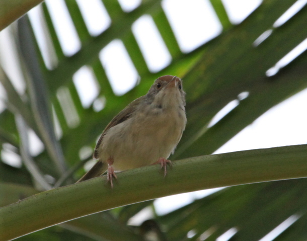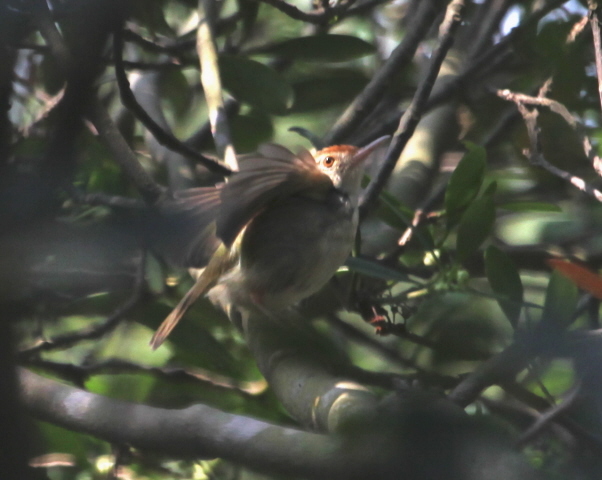 Actually, female common tailorbird has a tail of more reasonable length. So the bird in the photo may be a female. It also appears to have some dark feather bases on face and throat but rufous-capped babbler doesn't.