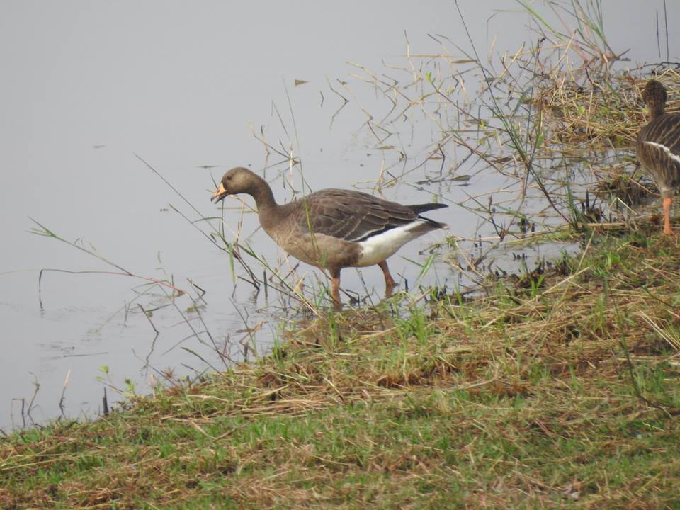 They look quite similar to Greylag Goose, but with orange legs, a slightly smaller bill, and browner plumage. The juveniles do not have the white foreheads of the adults.