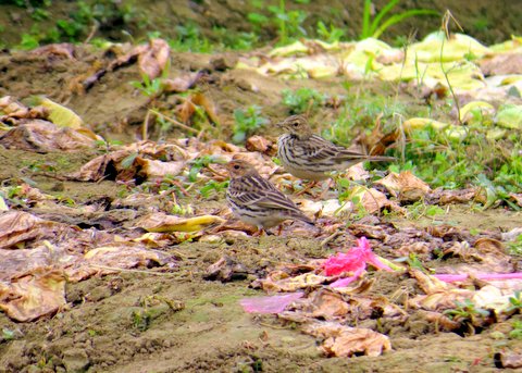 You may like to consider these are from an entirely different family to the Buntings~ These are Red-throated Pipits, you may observe their behaviour is different to that of Buntings where they walk and wag their tails frequently. Also note the red throat on one of the individual.