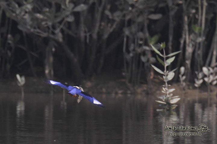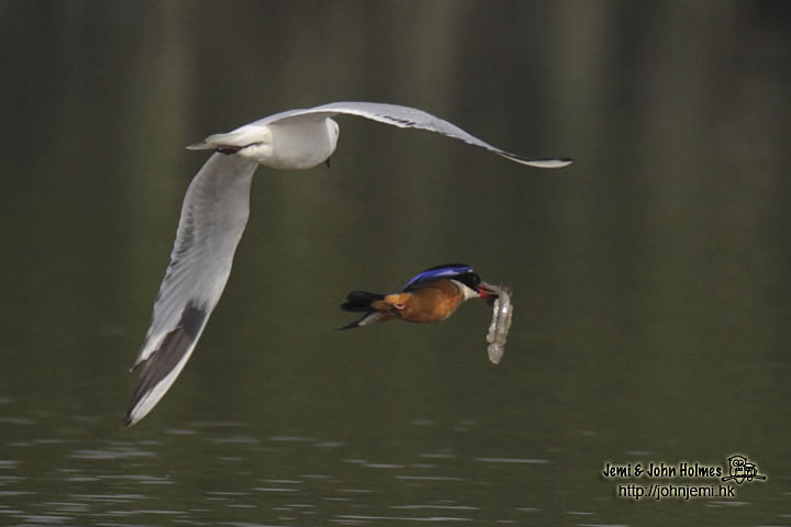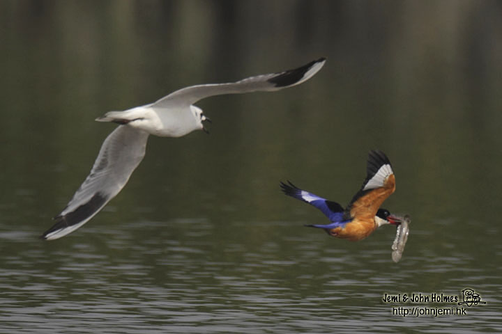 Black-capped Kingfisher, pursued by Saunders's Gull