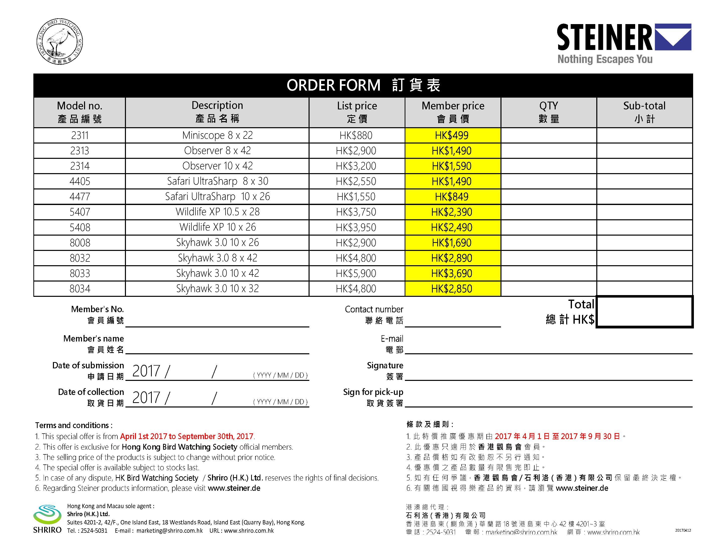 Steiner 望遠鏡優惠 2017年4月至9月