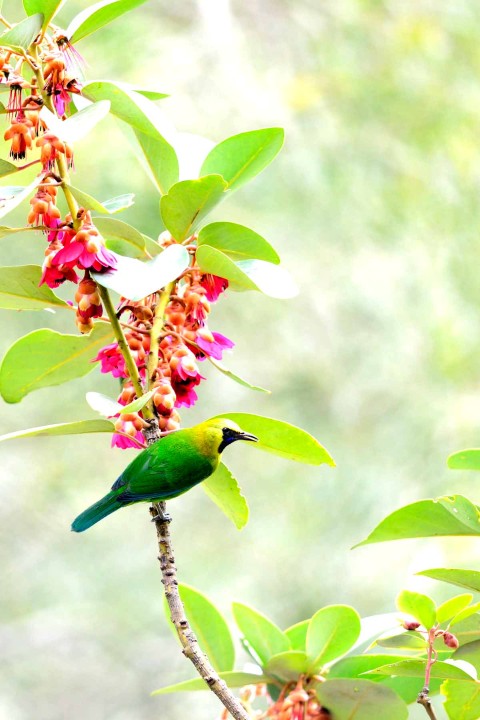 A leafbird perched prominently on a chinese new year flower plant Enkianthus quinqueflorus on the sixth day of the Year of the Horse. Its vibrant iridescent coloured plumage grew with the crimson flowers brightened up the Taipokau Nature Reserve. The blue-winged leafbird welcomes the new year.