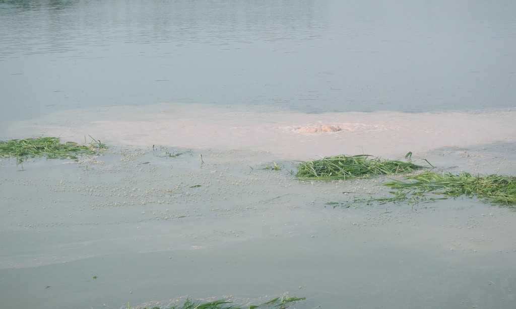魚塘冒出的氣泡,揚起傾瀉入魚塘的泥漿(攝於8月7日)