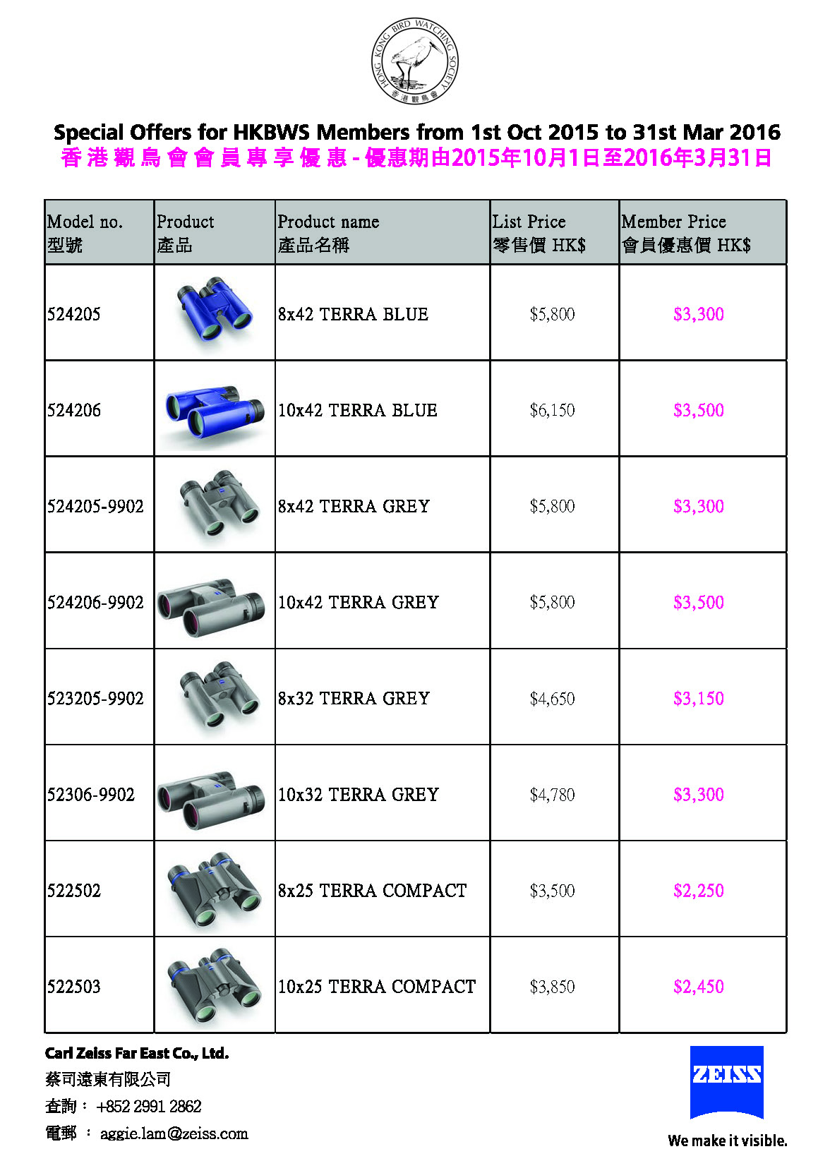 ZEISS 望遠鏡優惠 ~ 2015年10月 至 2016年3月