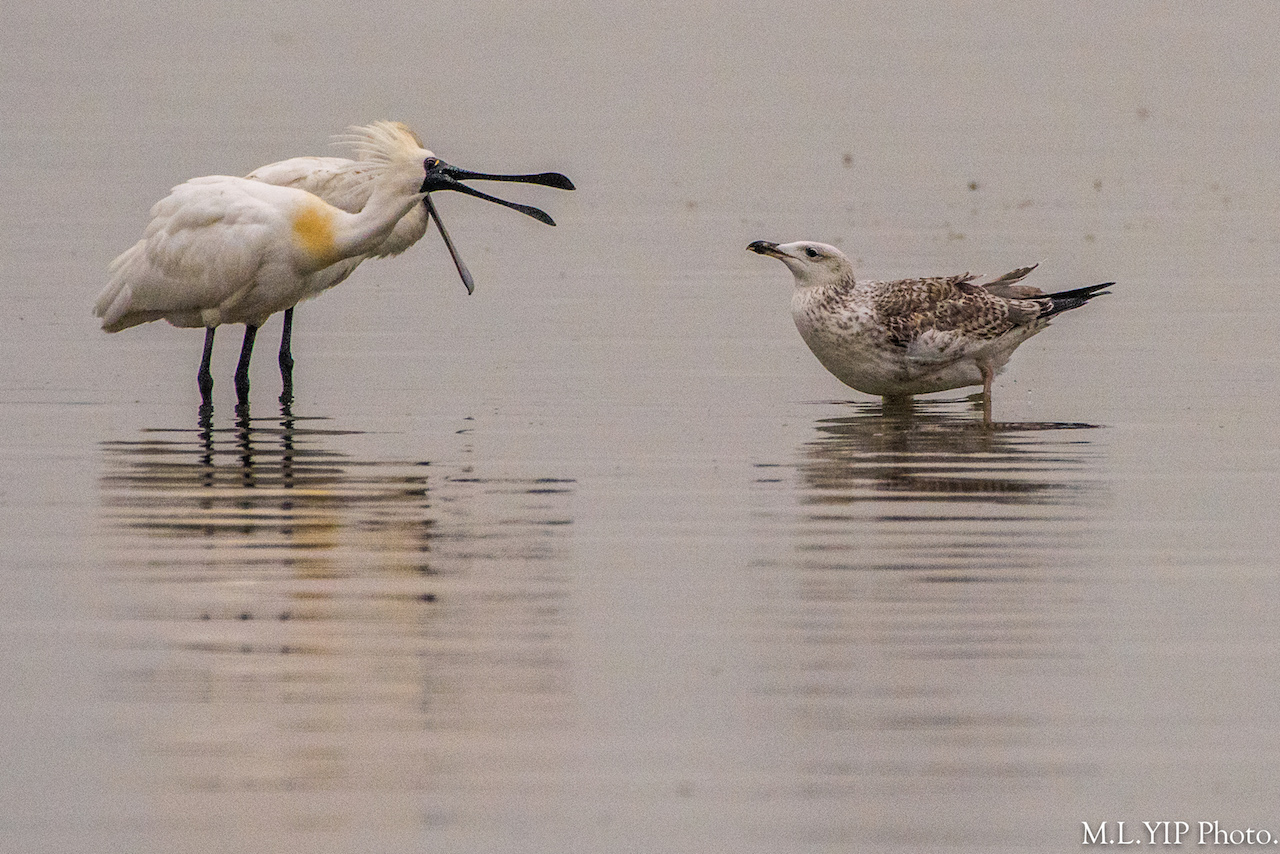 黑臉琵鷺與灰背鷗本屬不同的科種,但在泥灘上,它們又似乎是有點交流和溝通.