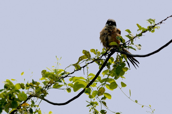 After dissected a grasshopper and gobbled up most part of it, this shrike aviated to the mid-air to lay her plumed feather. Her fearsome beak and scales shone relentlessly under the sun-ray. The prominent black masked eyes stretched parallel with the overhanging electric wire. She is a fierce long-tailed shrike.