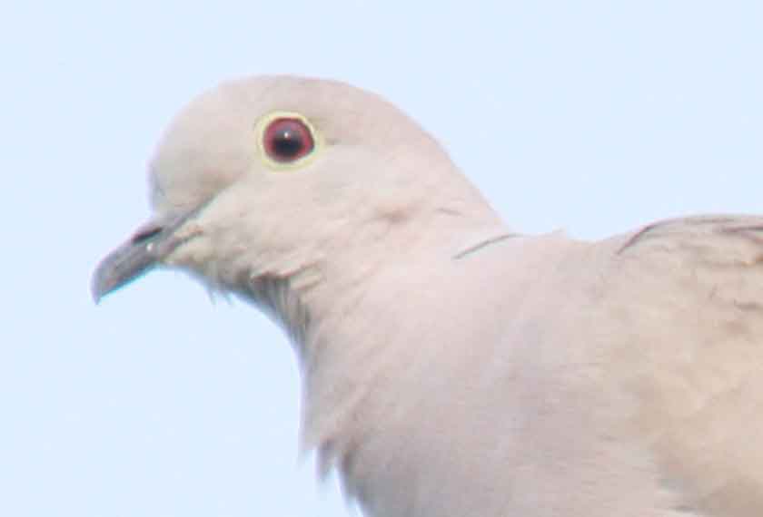 Typically, Eurasian Collared Dove in the field looks like a larger, paler bird than Red Turtle Dove. Once you are familiar, this is easy to recognise in the field (much easier than looking in detail for the colour of the iris!)